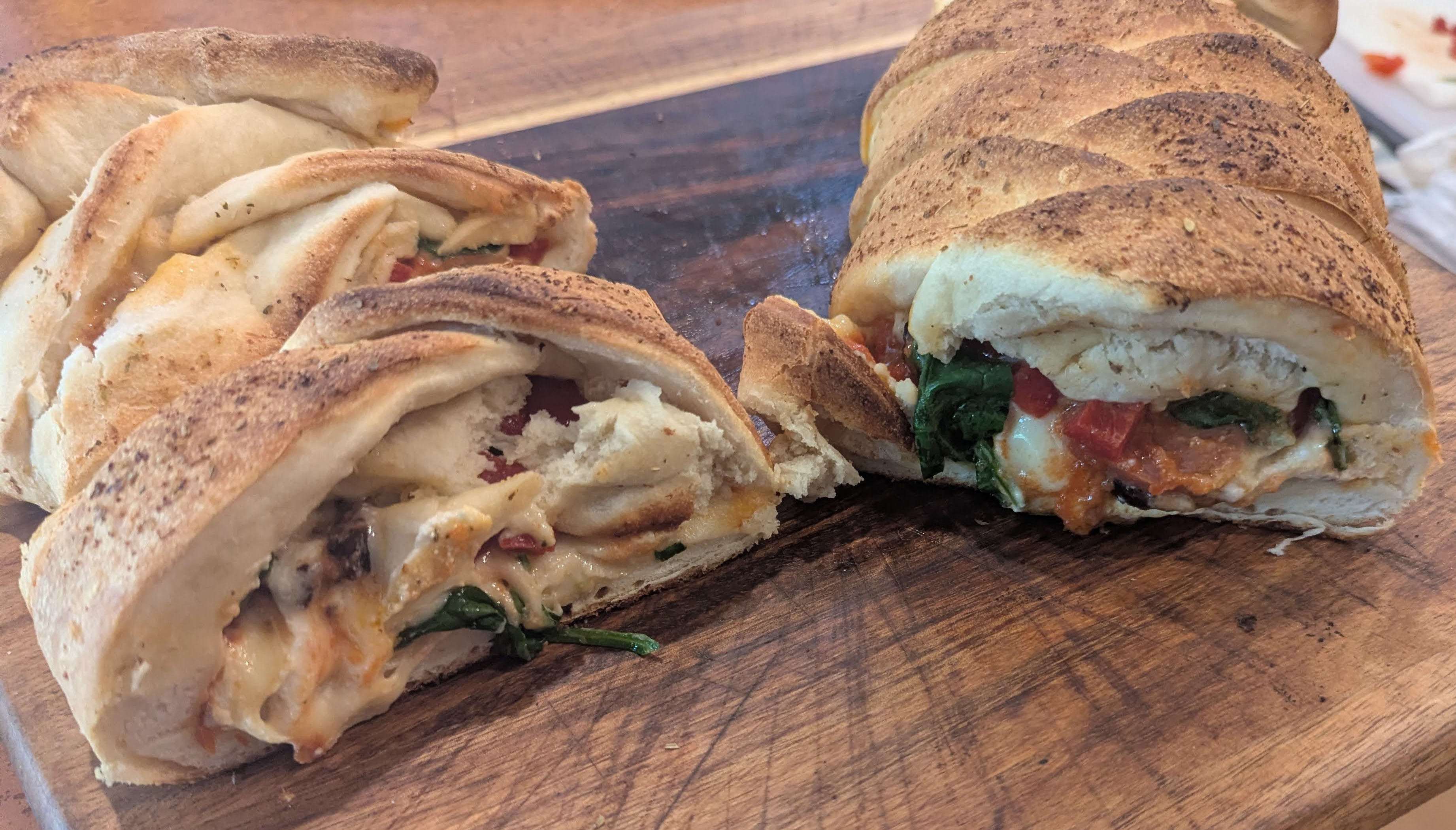 Combine 1/2 c. water, olive oil, sugar, and salt in mixing bowl, then add the bloomed yeast mixture. Stir in 1 c. of flour at a time, then need until smooth. Allow to rest 10 minutes and give a final knead. Shape into a large rectangle. Cut lattice prongs, add toppings, and weave lattice (alternatively, shape into 2 circles, add toppings, and fold over and crimp).