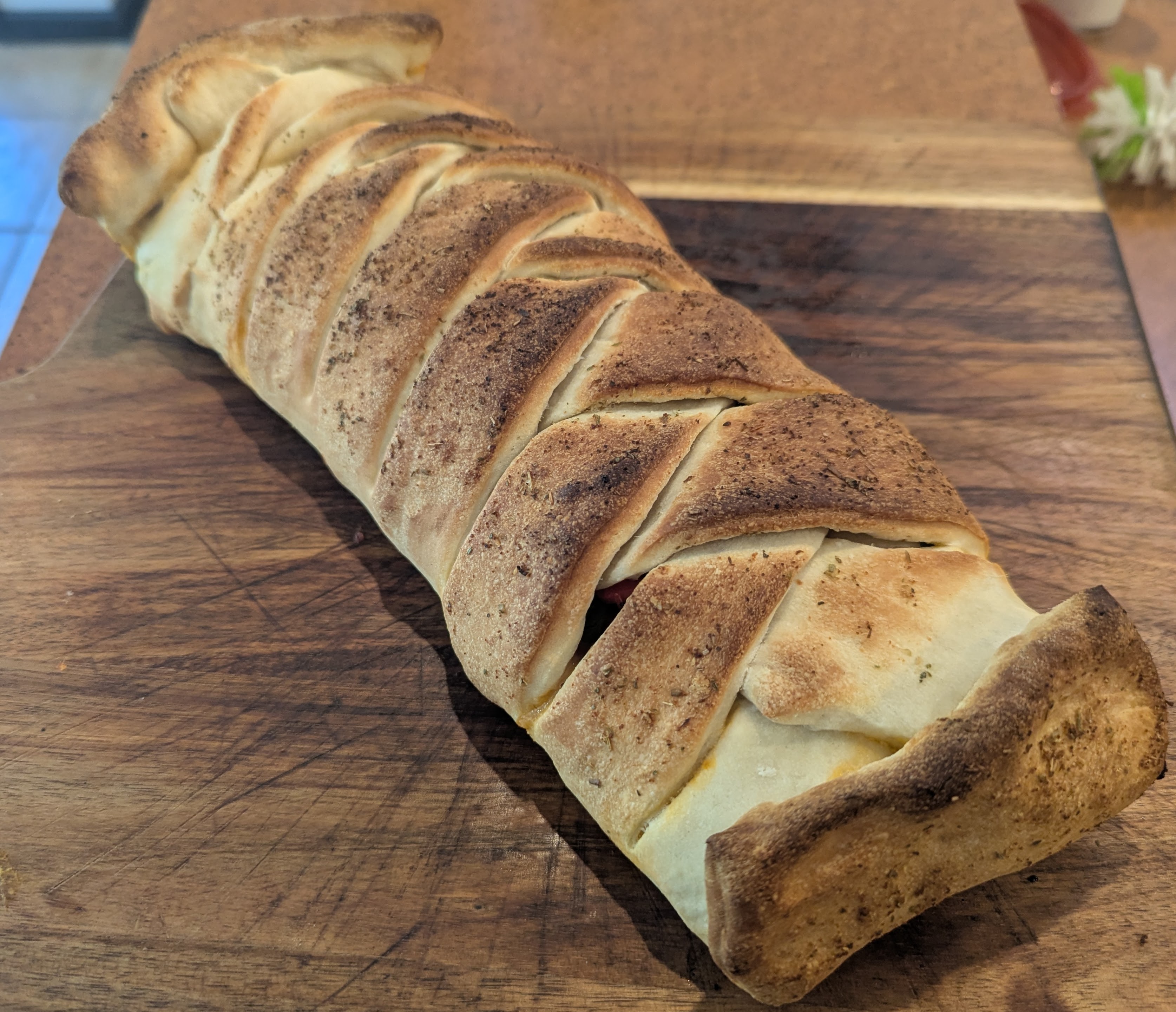 Melt butter with herbs on stovetop, then brush onto calzone(s). Bake at 500°F for 10-12 minutes.